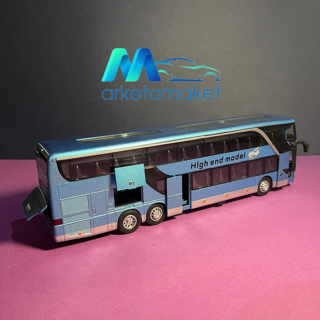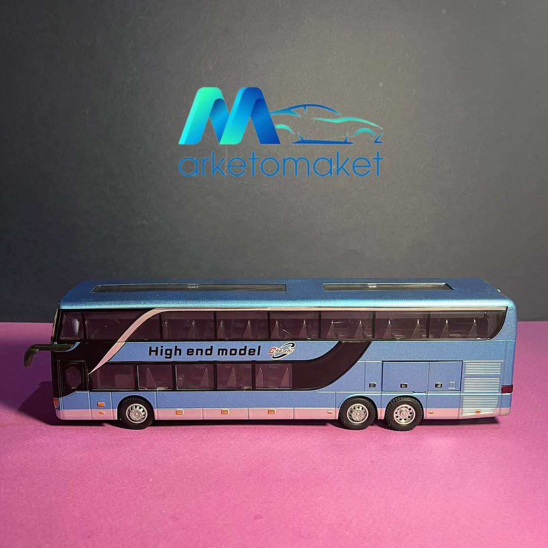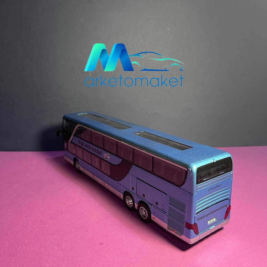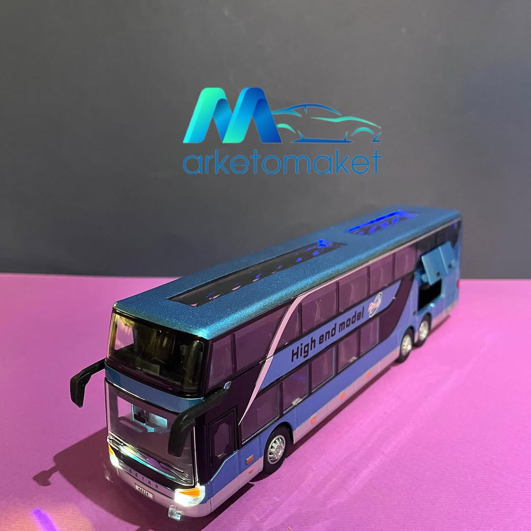 ماکت اتوبوس بین شهری بدنه تمام فلزی چراغدار داخل ماشین با جزییات کامل چرخهای عقب دوبل فرمانپذیر صدای موتور شبیه سازی شده.